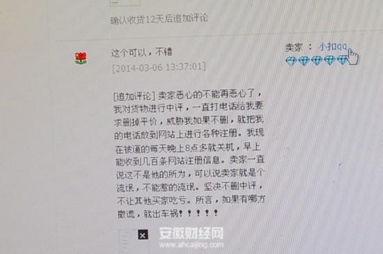 因为有早睡习惯,3月13日夜里21时许,周丽快临睡时接到一个陌生电话,“对方问我,是不是在淘宝上买了家居东西,我就想起了那家店。”周丽应允后,对方开门见山,表示自己是家居店卖家,看到周丽留下的“中评”后,怕影响生意,“希望我能改掉或是删除”。