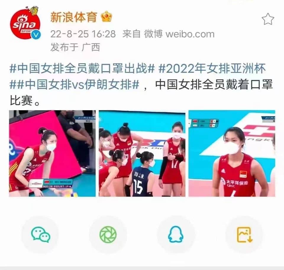 在菲律宾参加2022年女排亚洲杯的中国女排,在与伊朗女排的比赛中竟戴着口罩,令人震惊。评论员和网友纷纷留言:“简直是体育史上从未见过的荒唐”“剧烈运动戴口罩对身体的伤害不可逆”“戴口罩比赛,运动量大,容易猝死”“哪个混账领导下的混账命令?!” 第一局中国队失利,摘下口罩后以3比1获胜。
