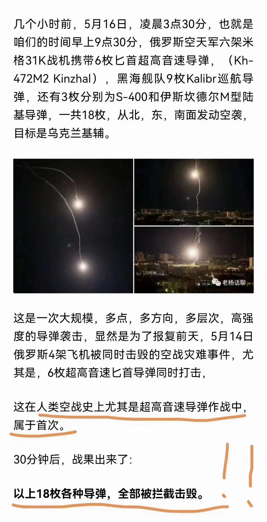 这是一次大规模,多点,多方向,多层次,高强度的导弹袭击,显然是为了报复前天,5月14日俄罗斯4架飞机被同时击毁的空战灾难事件,尤 其是,6枚超高音速匕首导弹同时打击,这在人类空战史上尤其是超高音速导弹作战中,属于首次。